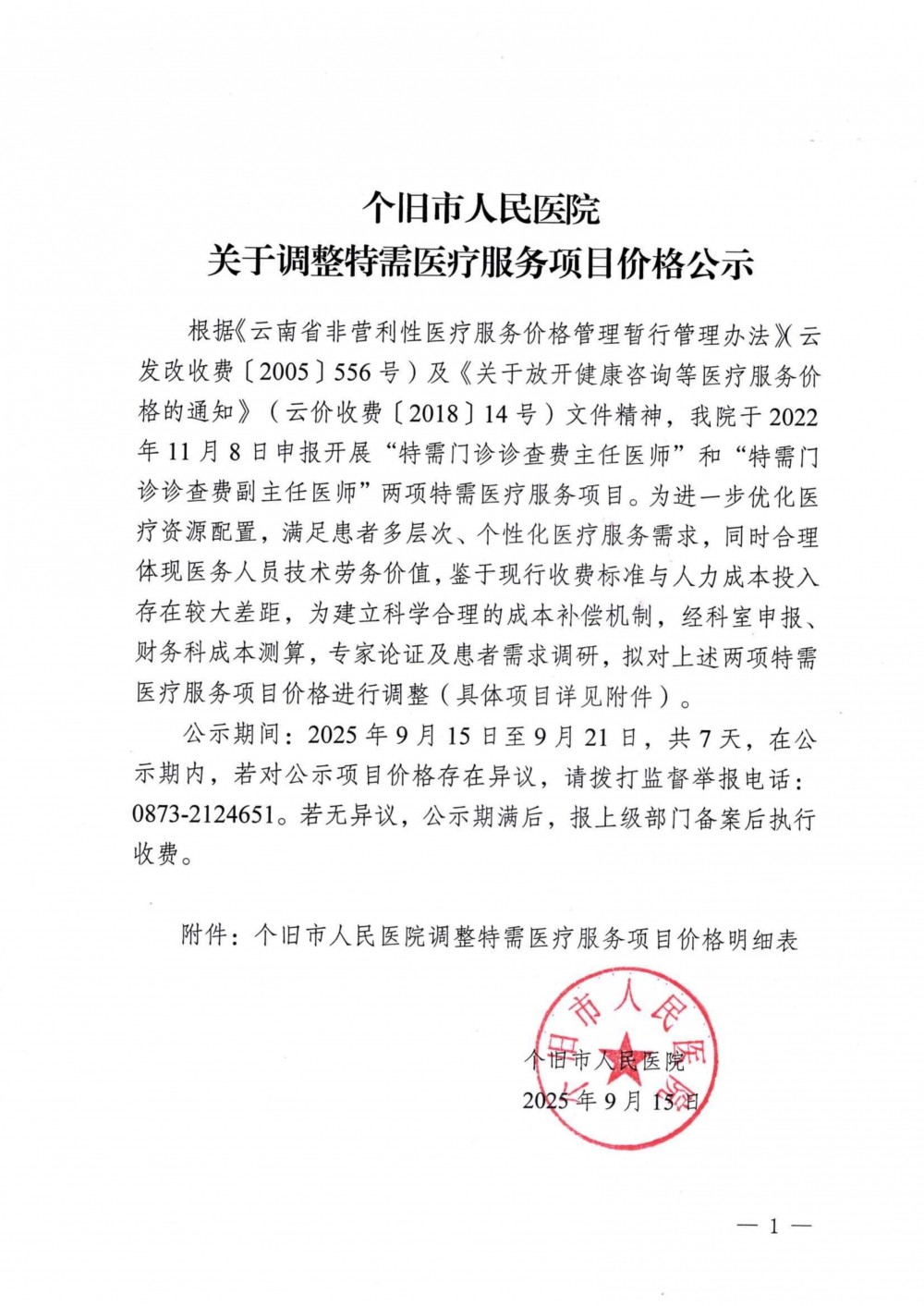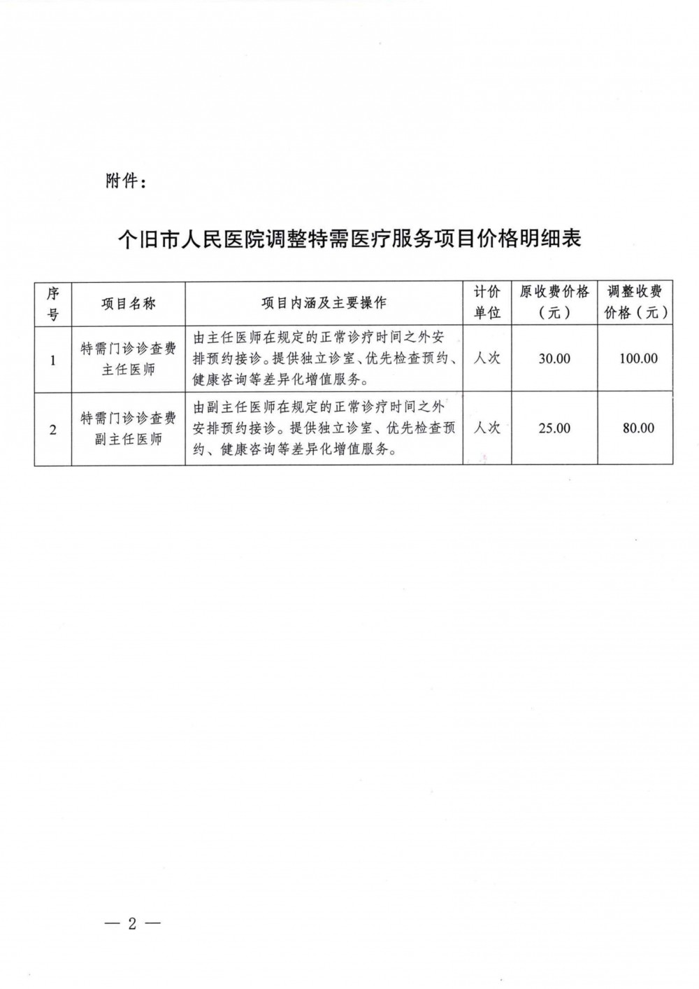 关于调整特需医疗服务项目价格公示