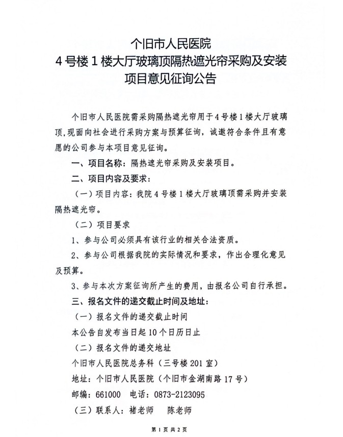 【征询】4号楼1楼大厅玻璃顶隔热遮光帘采购及安装项目意见征询公告